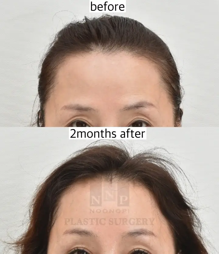 Even for patients with thinning hair or receding hairline, scars fade significantly over time. Below photos are Endoscopic forehead lift before after results from Noonopi Plastic Surgery.